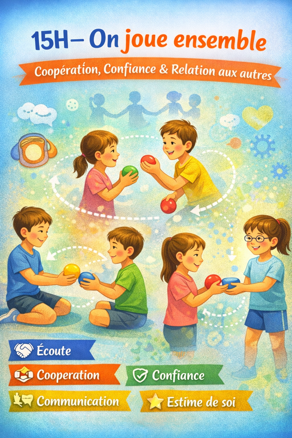 Thème : coopération, confiance et relation aux autres Cet atelier utilise les balles comme support pour développer l’écoute, la coopération et la confiance.Les exercices en binôme ou en groupe invitent les enfants à se synchroniser, s’adapter et trouver leur place dans le collectif. Objectifs : Développer l’écoute et l’attention à l’autre Encourager la coopération plutôt que la compétition Renforcer la confiance en soi et dans le groupe Améliorer la communication non verbale Favoriser le plaisir d’agir ensemble 👉 Parfait pour enfants timides, en difficulté relationnelle.